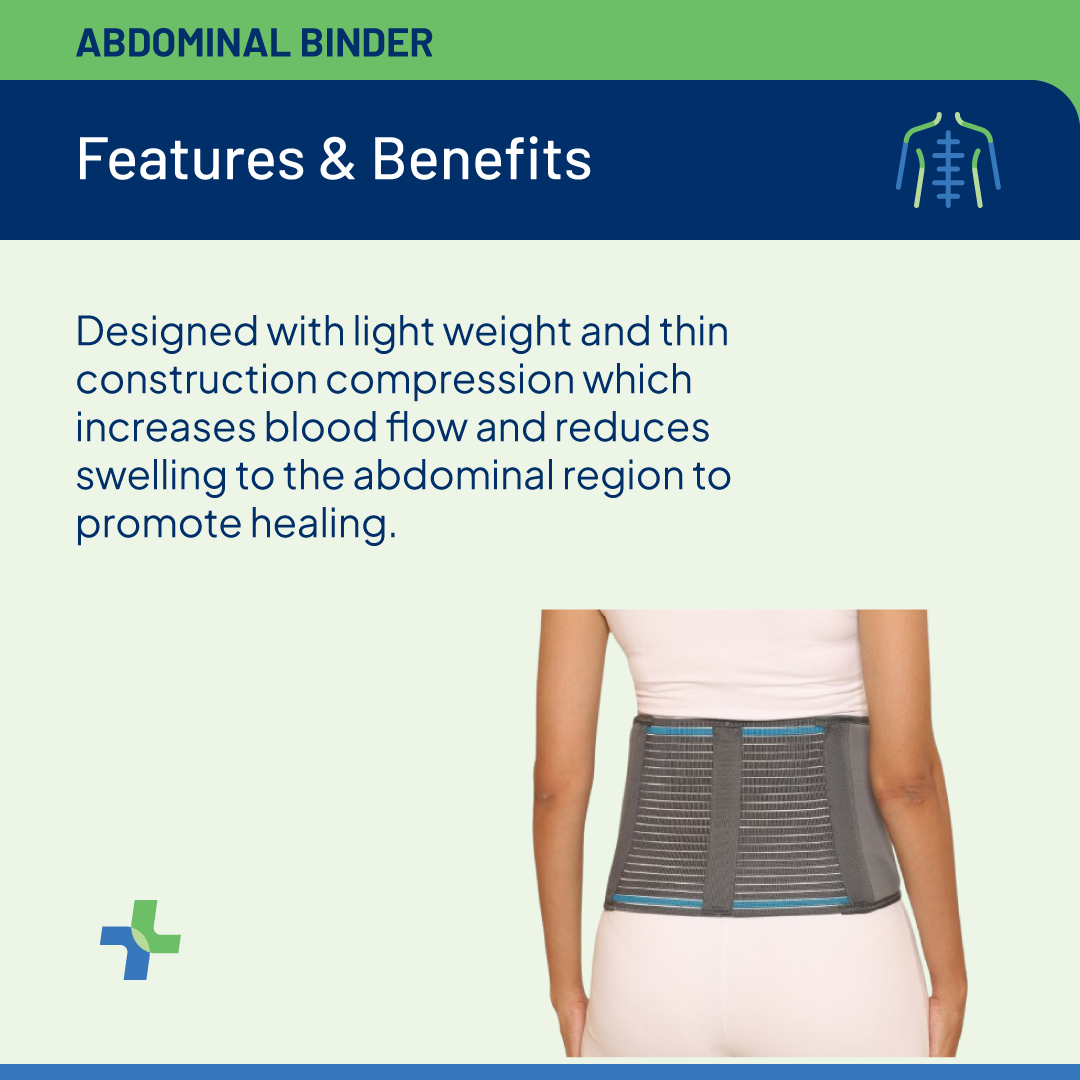 Features: Designed with light weight and thin construction compression which increases blood flow and reduces swelling to the abdominal region to promote healing