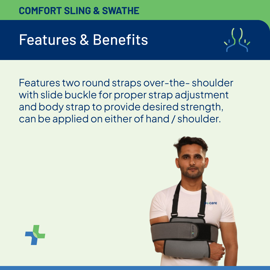 Users Instruction :- Separate sling from swathe and put swathe to one side, hold sling and place arm in sling so that it is centered between elbow and fingers, release hook closure on straps and place straps over neck, hold right strap and bring across centre of back and under left side of sling. Secure hook to sling, hold left strap and bring across centre of back and under right side of sling. Secure hook to sling, adjust sling buckles on sling to keep elbow at 90 degrees and hold swathe to attach hook on front of sling, wrap around body over affected arm