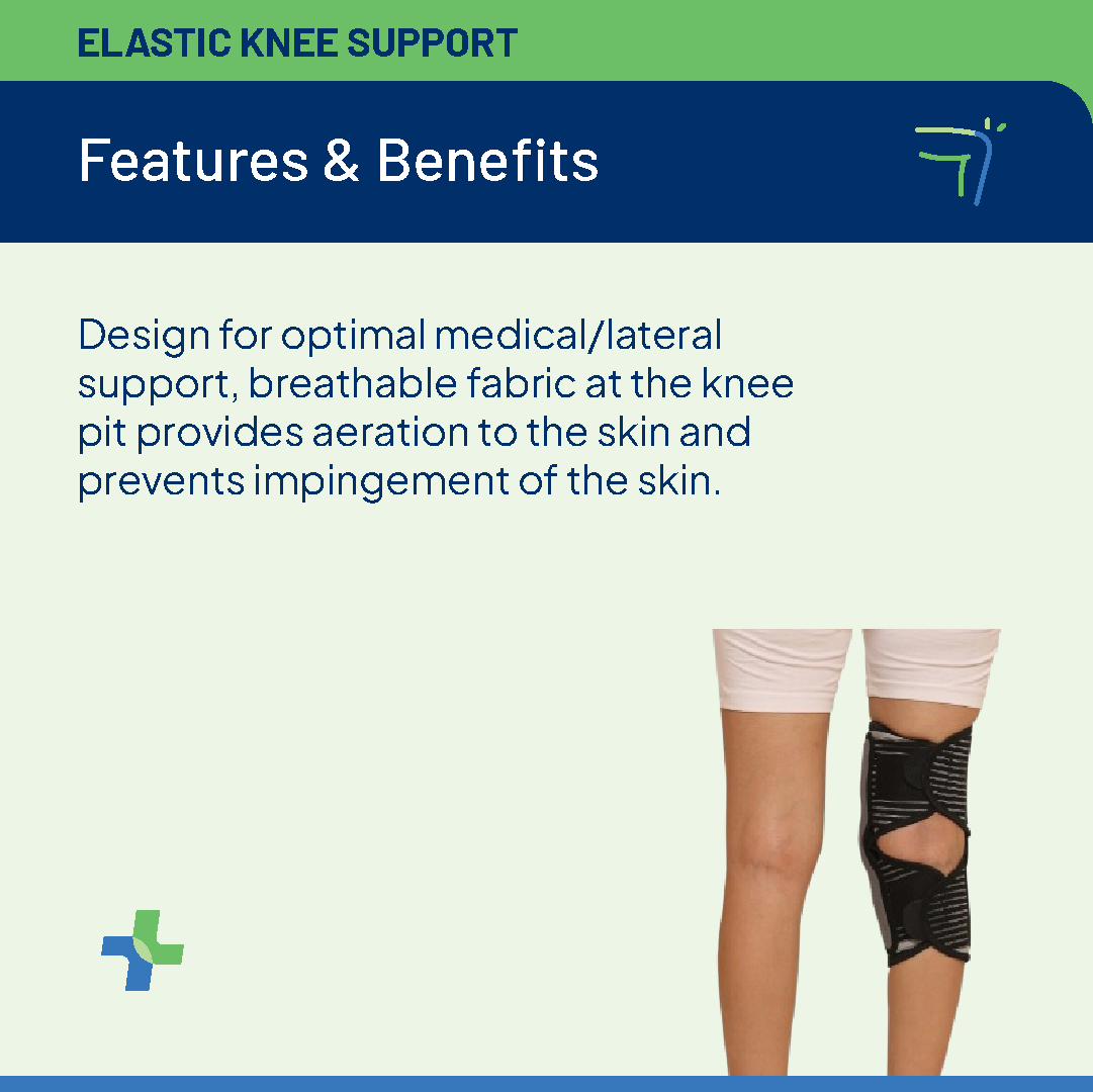 Features: Design for optimal medical/lateral support, breathable fabric at the knee pit provides aeration to the skin and prevents impingement of the skin