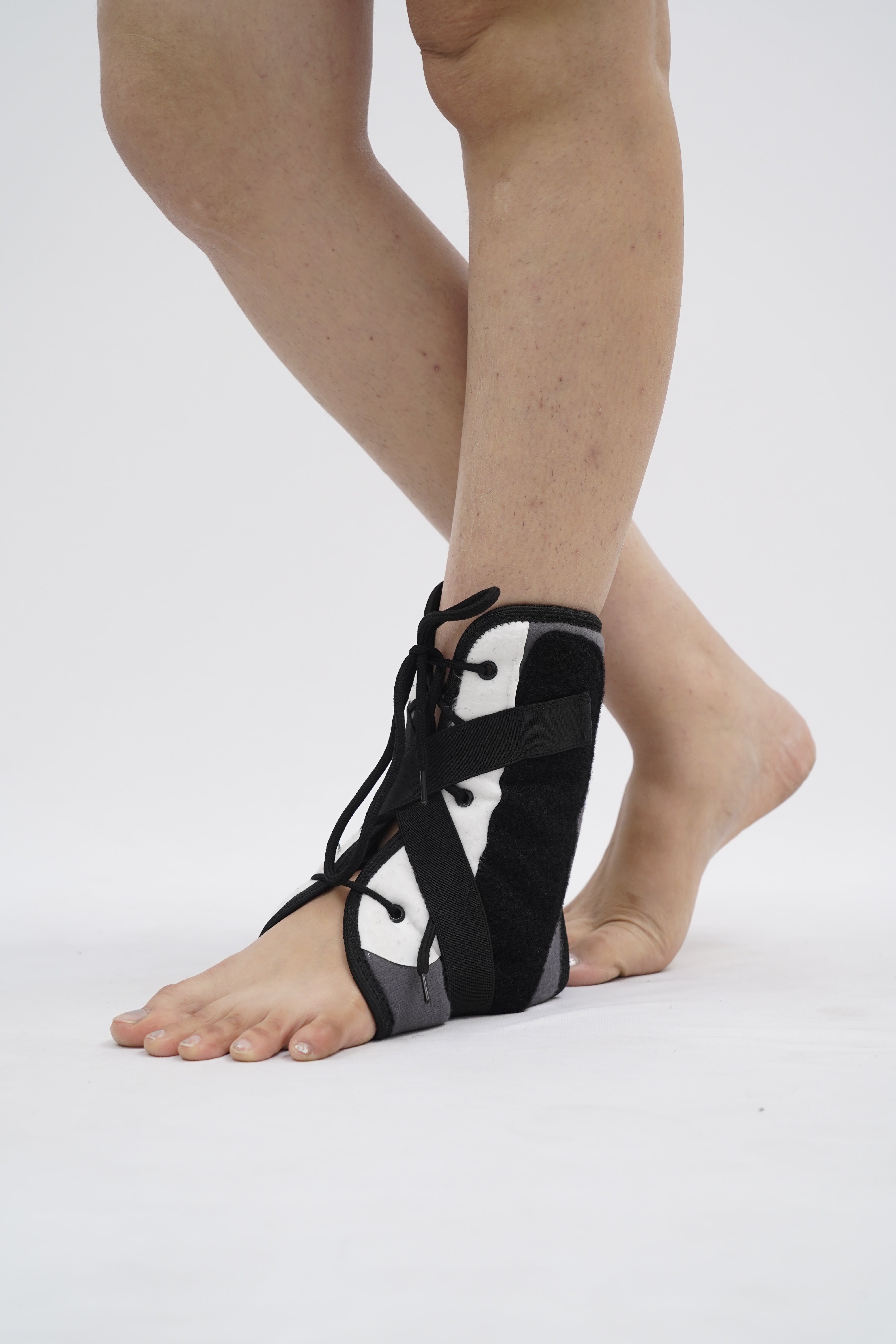 Users Instruction :- Release laces, slip foot through support, ensure heel is positioned comfortably with ankle positioned at 90° snug laces from distal to proximal, tighten and tie to desired comfort level, hold support straps on each side of lacing. Cross straps in front of foot, wrap under foot and up opposite side of ankle, securing hook portion to loop on side of support. Ankle support should be snug, but not inhibiting circulation.